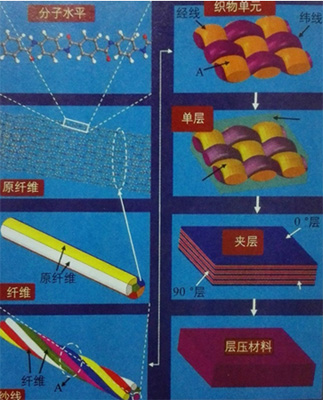 美国Clemson大学与军队研究实验室武器和材料研究理事会研究高比强度、高比刚性连续P-ARF增强的树脂基复合材料的形成机理,其中涉及到的工艺参数包括分子链、微纤维、纤维、纱线、织物/层数、单层压件、叠加层压和层压材料(图30)。通过简化子弹冲击方案的非线形动态/固定元件的分析,找出最佳的成型工艺参数。美国军队研究实验室一直从事士兵防护武器威胁的研究,包括P-ARF和UHMWPEF材料动态性能的表征、材料动力学造型和模拟、纳米材料的合成和表征、聚合物基体材料的配置和表征、脑部受凸伤和爆破影响的神经病表征、骨头和软组织在受武器作用的高速损伤机理的高性能计算模拟、骨头和软组织的物理表征。此外还开展了10项相关的应用研究,目的是进一步实现轻量化,提高防护效果、降低成本和扩大应用领域。美国Fibrf lex公司是生产P-ARF、CF、GF、增强N-6、N-66、PPS、PEEK、ABS/PC、PEI、PP、FEP等复合材料的厂家,应用于无人机和武器部件等。值得一提的是,俄罗斯SVM、ARMOS、RUSAR、ARTEC等系列高性能芳杂环酰胺共聚纤维的防弹和高压容器的基础和应用研究也取得了重大成果,为推动航空航天和国防军工的发展做出贡献。我国的芳纶Ⅲ已有 4 家企业在小批量生产,总产能450 t/a,为国防军工作出了贡献,但产品更新换代方面不及俄罗斯。