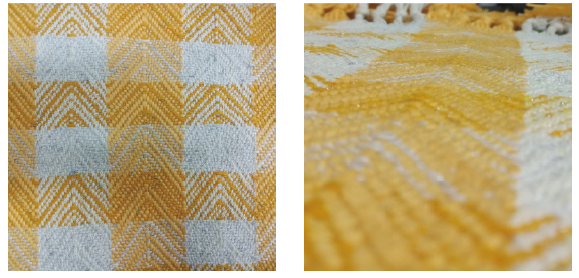 3、以竹节纱和圈圈纱为原料,用蜂巢组织织成的中厚型面料,立体感强,圈圈纱和竹节纱的使用增添了织物的毛型感、凹凸感以及柔软度。成品美观、手感柔软、保暖性好,有类似华夫格的外观,可用作地毯、茶巾、垫子、艺术类装饰挂画等,且面料毛型感极强,可增添环境的温暖舒适氛围,作地毯柔软有弹性,作挂画富有装饰性。